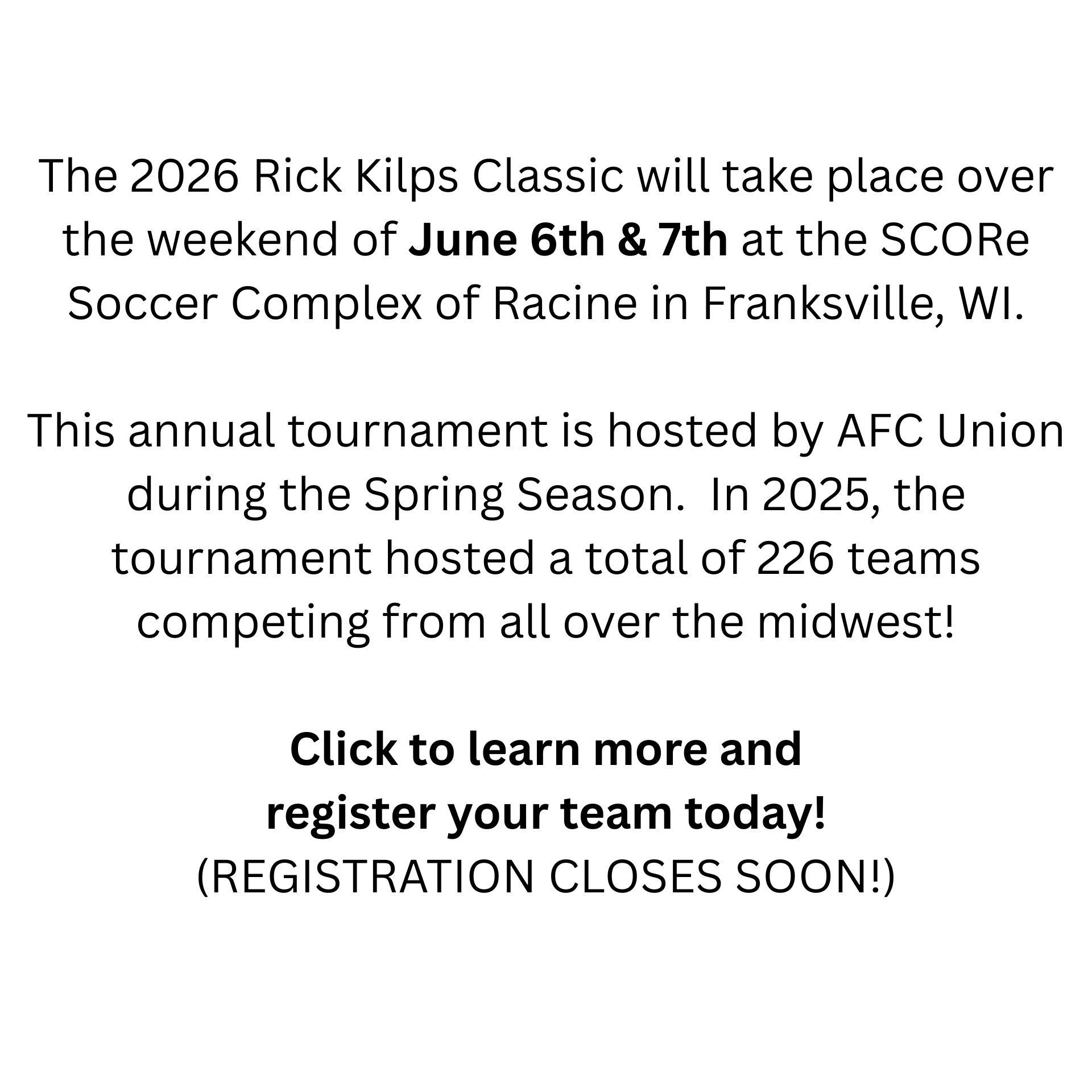 The 2026 Rick Kilps Classic will take place over the weekend of June 6th & 7th at the SCORe Soccer Complex of Racine in Franksville, WI.