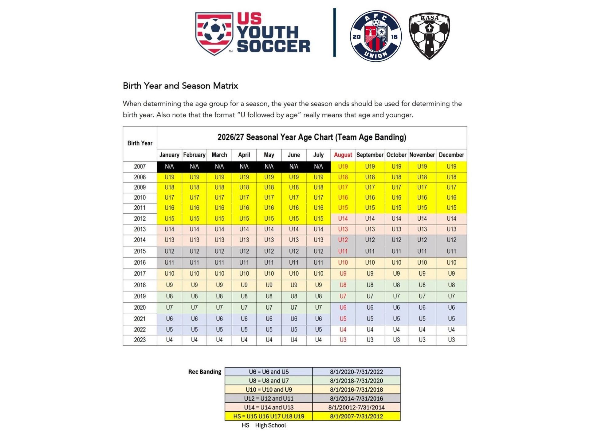 - In collaboration to create a unified path forward in player development and age groupings, the largest youth soccer governing bodies (i.e., US Youth Soccer, US Club Soccer, and AYSO) have collectively agreed to move to an age group formation cycle.